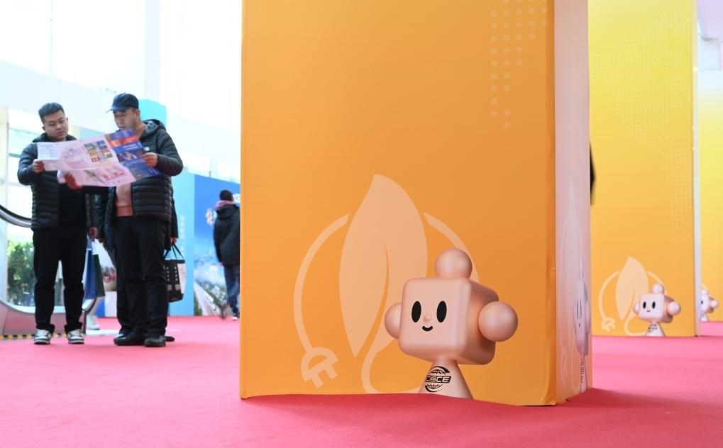 ?11月29日,通往鏈博會會場通道處的立柱上帶有醒目底色的“鏈氪”形象標(biāo)識引導(dǎo)參觀人群。新華社記者 李賀 攝