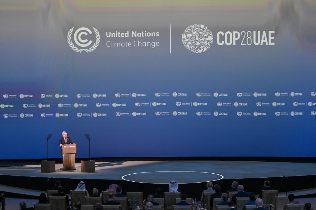 2023年12月1日,聯(lián)合國(guó)秘書長(zhǎng)古特雷斯在阿聯(lián)酋迪拜世界氣候行動(dòng)峰會(huì)開幕現(xiàn)場(chǎng)致辭。新華社發(fā)(聯(lián)合國(guó)氣候變化迪拜大會(huì)供圖)