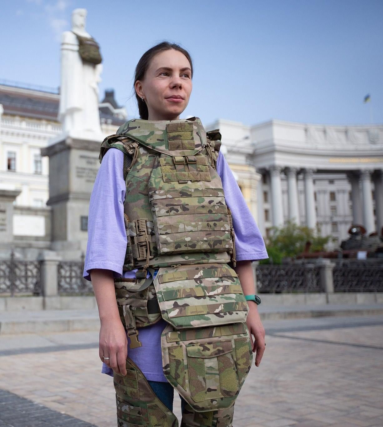 當(dāng)?shù)貢r(shí)間2023年9月14日,烏克蘭基輔,一名婦女在基輔展示為女兵特別設(shè)計(jì)的防彈衣。