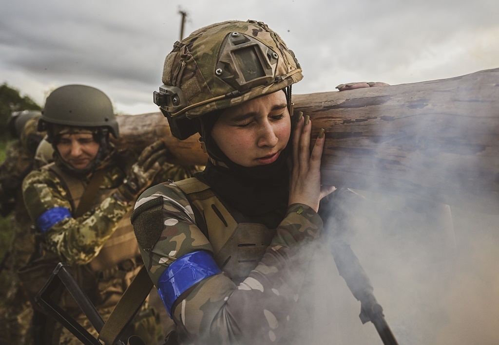 當(dāng)?shù)貢r(shí)間2023年7月15日,扎波羅熱地區(qū),烏克蘭女兵進(jìn)行力量配合進(jìn)行訓(xùn)練。