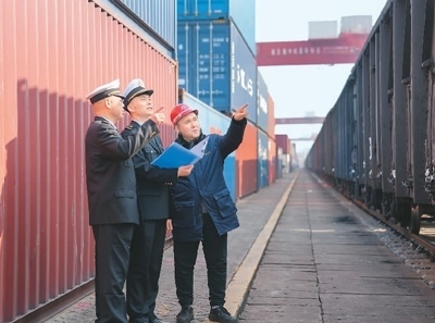 中哈(連云港)物流合作基地哈方派駐人員阿金漢(右一)在查看班列集裝箱。楊澤浩攝