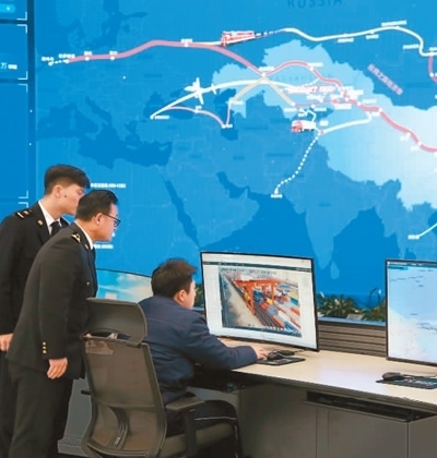 在中哈(連云港)物流合作基地數(shù)字化調(diào)度中心,海關(guān)關(guān)員在對中歐班列動態(tài)、現(xiàn)場裝卸情況等進(jìn)行實時監(jiān)控。近年來,連云港海關(guān)還創(chuàng)新應(yīng)用中歐班列“保稅+出口”集裝箱混拼、“鐵路快速通關(guān)”等通關(guān)便利化舉措,不斷提升貨物通關(guān)效率。本報記者 石 暢攝