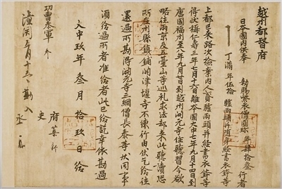 圓珍返回日本后,始終保持著與唐朝高僧、學(xué)者的交流。他在年近古稀時(shí)仍一心鉆研佛法,并修書向大唐僧人尋求關(guān)于佛法的權(quán)威解釋。在被稱為《圓珍疑問(wèn)》的書信中,他摘引多部佛法經(jīng)典并列舉疑問(wèn),文中出現(xiàn)“乞垂委示”“其義如何”“唐言如何”等請(qǐng)求回答的表述。書信于882年寄往長(zhǎng)安友人處,現(xiàn)存版本是圓珍抄錄的副本。