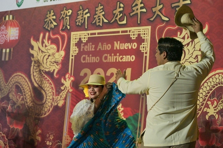 2月17日,在巴拿馬奇里基省首府戴維市,一群身穿巴拿馬民族服飾的舞者在奇里基春節(jié)慶?;顒由媳硌?。新華社記者陳昊佺攝