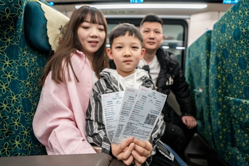 2月14日,乘坐中老鐵路國際旅客列車前往老撾的游客展示購買到的車票。