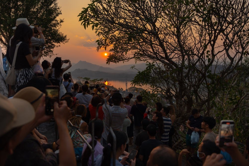 2月16日,在老撾瑯勃拉邦普西山山頂,游客在觀賞落日景觀。湄公河畔、老撾北部群山環(huán)繞的瑯勃拉邦在14到16世紀間曾是老撾歷史上第一個統(tǒng)一的多民族國家瀾滄王國的首都?,槻罟懦?995年被聯(lián)合國教科文組織列入世界文化遺產,如今已經成為老撾歷史與文化的象征。