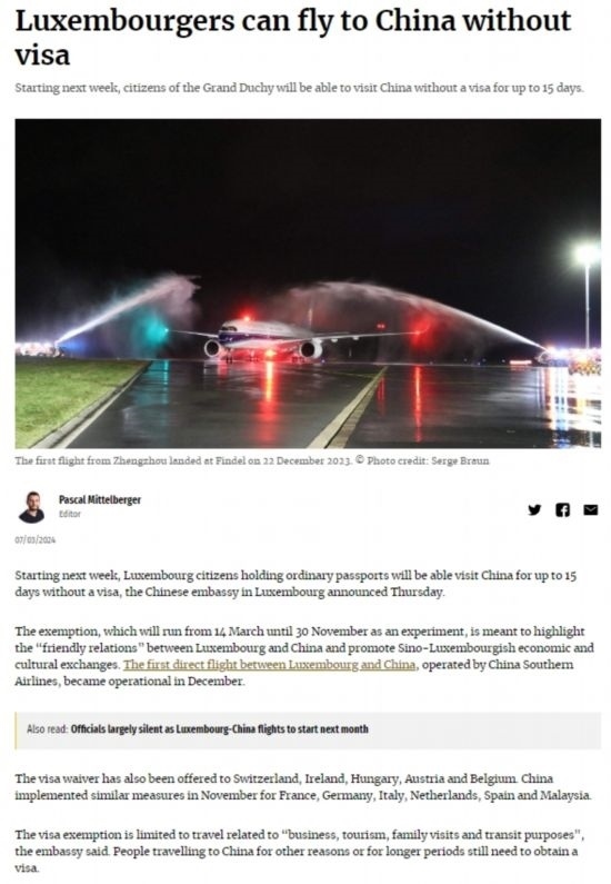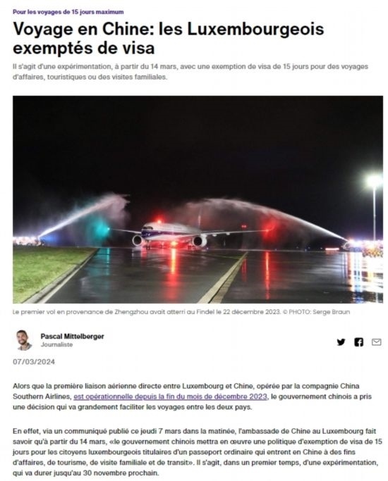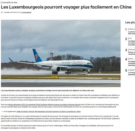 盧森堡廣播電視臺、《日報》、《盧森堡時報》、編年史、逗號網(wǎng)等當?shù)馗鞔笾髁髅襟w、網(wǎng)站迅速報道免簽消息,認為兩國開通客運直航和中方對盧實施免簽政策是盧中“空中絲綢之路”建設(shè)取得的新成果,將進一步便利兩國人員往來,促進各領(lǐng)域交流合作。盧工商界和民眾對免簽政策落地感到欣喜,期待赴華參訪旅游,開展更多務實合作。