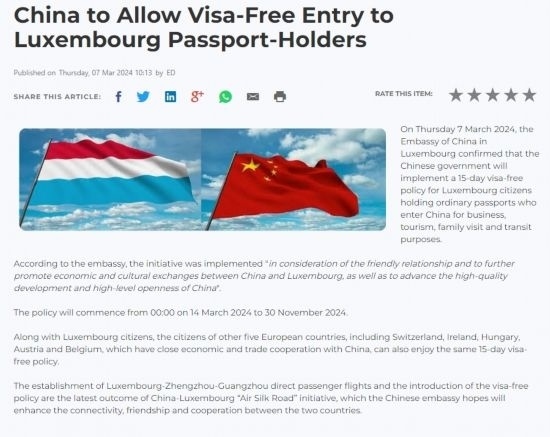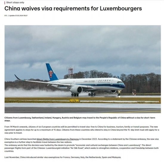 近日,中國政府決定自2024年3月14日0時起至2024年11月30日24時,對包括盧森堡在內(nèi)的6國持普通護照人員實行部分免簽。中國駐盧使館及時向盧外交部等部門和主流媒體作了通報,盧政府和媒體對中方免簽政策予以高度評價。
