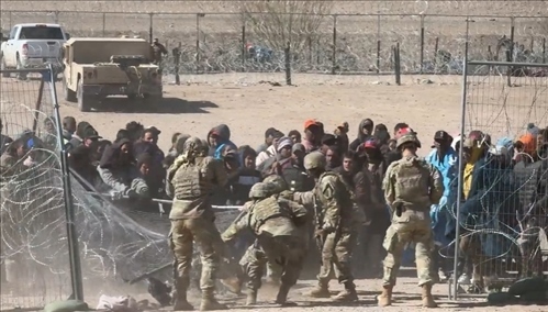 視頻畫面顯示,大批成年男性沖破州政府設(shè)置的鐵絲網(wǎng),將得州國民警衛(wèi)隊的一些士兵撞倒,并跑向邊界墻。 現(xiàn)場一片混亂,可以聽到有士兵對移民大叫“滾回去!”