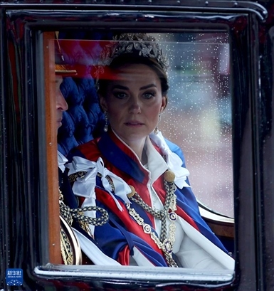 2023年5月6日,凱特王妃在英國倫敦參加英國國王查爾斯三世的加冕儀式后,乘馬車從威斯敏斯特教堂返回白金漢宮(資料照片)。新華社記者 李穎 攝