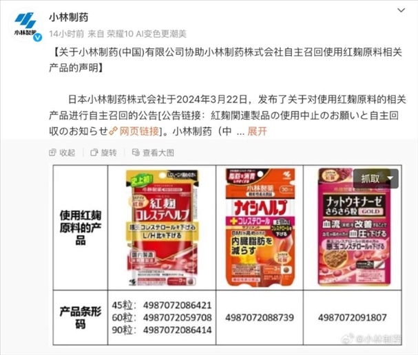 小林制藥生產(chǎn)的紅曲原料除供自家生產(chǎn)保健品外,還出售給其他公司用于釀酒及食品制造等。調(diào)查顯示,“意想不到”的成分存在于小林制藥2023年4月至12月期間生產(chǎn)保健品的原料中。目前使用小林制藥產(chǎn)紅曲原料的食品和調(diào)料召回范圍已擴(kuò)大至日本全國。