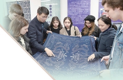 2024年3月20日,在江蘇南通市崇川區(qū)“文化崇川 游我所愛”中外文化交流活動中,來自俄羅斯、巴基斯坦、印度尼西亞、盧旺達等國家的學生現(xiàn)場了解藍印花布印染技藝。許叢軍攝(人民視覺)
