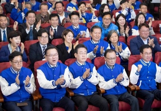 4月10日,在韓國首爾,韓國最大在野黨共同民主黨黨首李在明(前排中)與共同民主黨領(lǐng)導(dǎo)層共同慶祝出口民調(diào)結(jié)果大幅領(lǐng)先。新華社記者姚琪琳攝