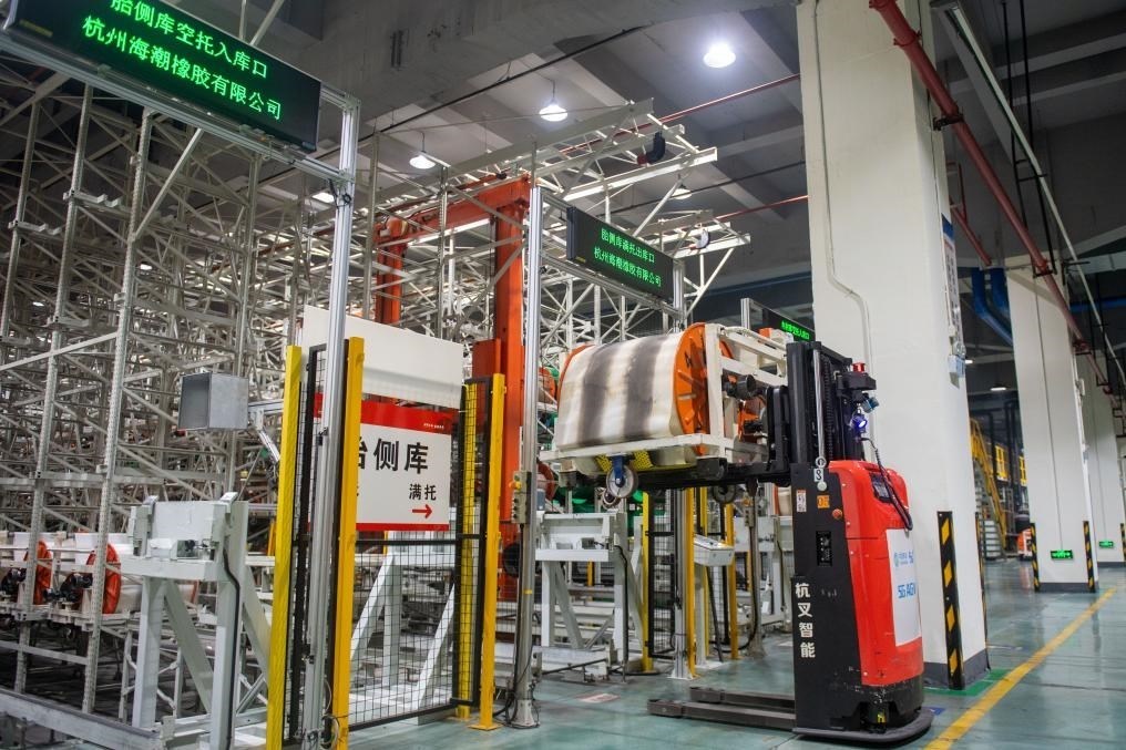 ?在杭州市錢(qián)塘區(qū)中策橡膠集團(tuán)股份有限公司未來(lái)工廠內(nèi),無(wú)人叉車(chē)在運(yùn)輸產(chǎn)品(2024年2月23日攝)。新華社記者 江漢 攝