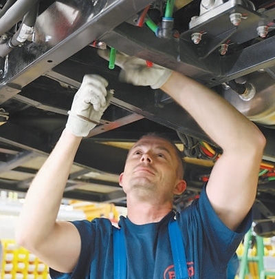 初夏時(shí)節(jié),多瑙河畔綠意盎然。在比亞迪匈牙利電動(dòng)大巴工廠的合裝車間,車間主任阿爾蓋·伊姆雷正在和工人們一起組裝大巴,這幾輛大巴訂單分別來(lái)自德國(guó)和希臘?!拔覀兊碾妱?dòng)大巴性能優(yōu)異,充電兩小時(shí)就可續(xù)航400公里,很受市場(chǎng)歡迎?!币聊防渍f(shuō)。