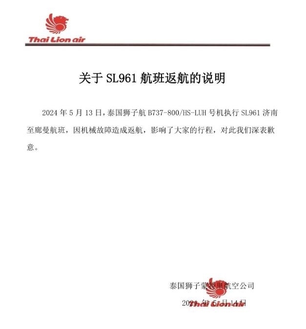 央視網(wǎng)消息:據(jù)泰國獅航公眾號消息,5月15日泰國獅航發(fā)布關(guān)于SL961航班返航的說明,2024年5月13日,泰國獅航B737-800/HS-LUH號機執(zhí)行SL961濟南至曼谷廊曼航班,因機械故障造成返航。該航司對此致歉。