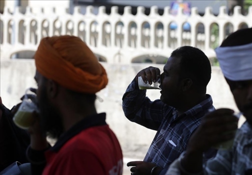 5月27日,在印度北部旁遮普邦阿姆利則地區(qū),人們?cè)谘谉岬奈绾蠛嚷愤吺圪u的甘蔗汁來(lái)消暑。新華社發(fā)(斯特林格攝)