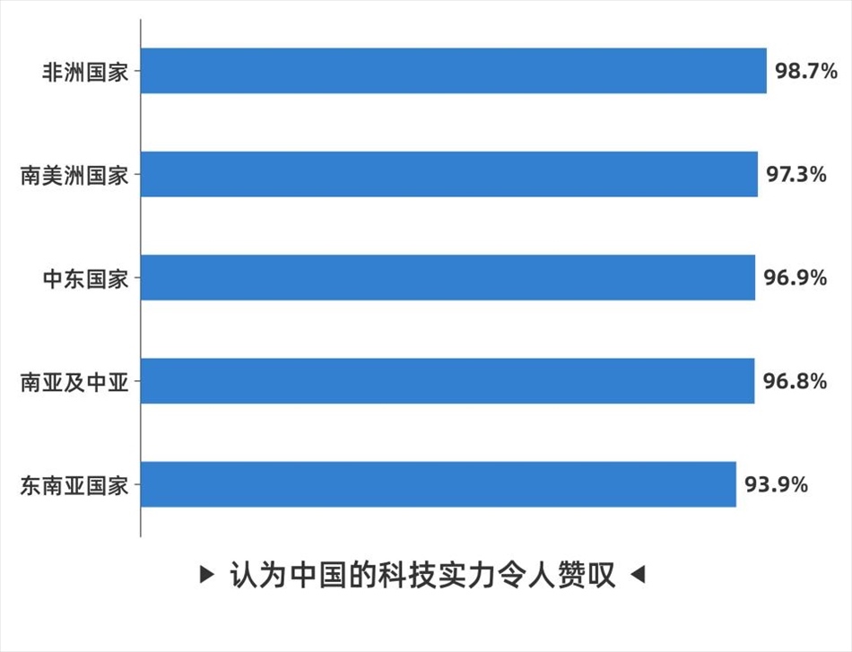 在科技表現(xiàn)方面,中國(guó)的科技實(shí)力同樣受到全球受訪(fǎng)者認(rèn)可。其中,92.3%的受訪(fǎng)者認(rèn)為中國(guó)的科技實(shí)力令人贊嘆,排名前五位的分別是非洲國(guó)家受訪(fǎng)者(98.7%)、南美洲國(guó)家受訪(fǎng)者(97.3%)、中東國(guó)家受訪(fǎng)者(96.9%)、南亞及中亞國(guó)家受訪(fǎng)者(96.8%)以及東南亞國(guó)家受訪(fǎng)者(93.9%)。