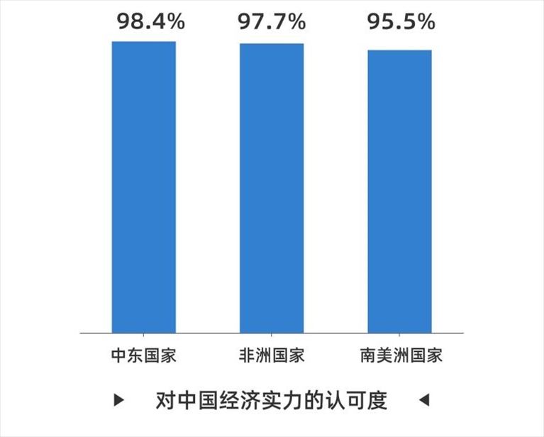在經(jīng)濟(jì)表現(xiàn)方面,92.3%的受訪(fǎng)者稱(chēng)贊中國(guó)經(jīng)濟(jì)實(shí)力強(qiáng)勁,這一調(diào)查結(jié)果與去年基本持平。其中,中東國(guó)家受訪(fǎng)者的認(rèn)可度達(dá)到98.4%,非洲國(guó)家和南美洲國(guó)家受訪(fǎng)者的認(rèn)同度分別為97.7%和95.5%。