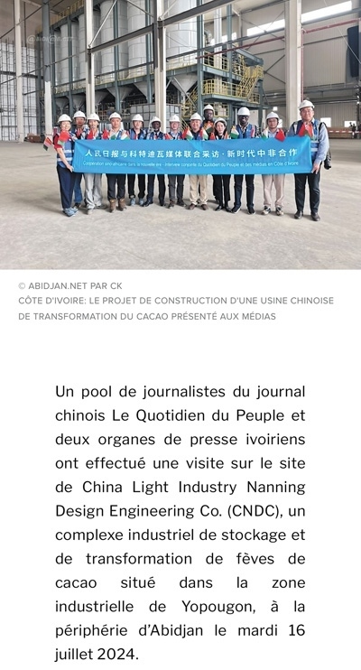 7月16日,人民日報與兩家科特迪瓦新聞機(jī)構(gòu)記者一行參觀了由中國輕工業(yè)南寧設(shè)計工程有限公司總承包的可可加工及可可豆倉庫建設(shè)項目,該項目坐落在阿比讓郊區(qū)的約普貢工業(yè)區(qū)。該公司負(fù)責(zé)人指出,該項目綜合體計劃于2024年年底完工,包括一個可加工5萬噸可可豆的工廠、可存儲14萬噸可可豆的倉庫以及培訓(xùn)中心、行政大樓等?!钥铺氐贤甙⒈茸尵W(wǎng)報道