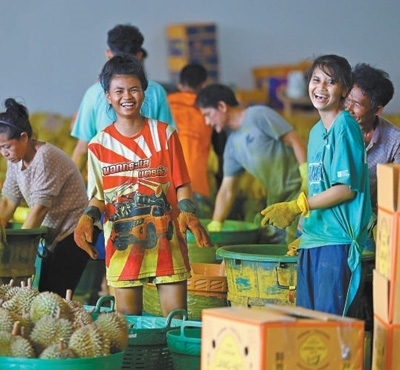 夜幕降臨,尖竹汶府漸漸熱鬧起來。水果加工廠里燈火通明,廠外道路上,運輸車輛疾馳而過。儂瓦的貨車也已離開工廠,滿載著美味的榴蓮駛向中國市場。