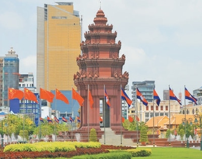 4月16日,在柬埔寨首都金邊市中心的獨立紀念碑前,中柬兩國國旗迎風飄揚。
