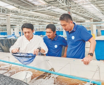 在柬埔寨干丹省一處羅氏沼蝦育苗場,上海海洋大學柬埔寨稻漁項目組成員指導當?shù)毓ぷ魅藛T進行苗種培育。