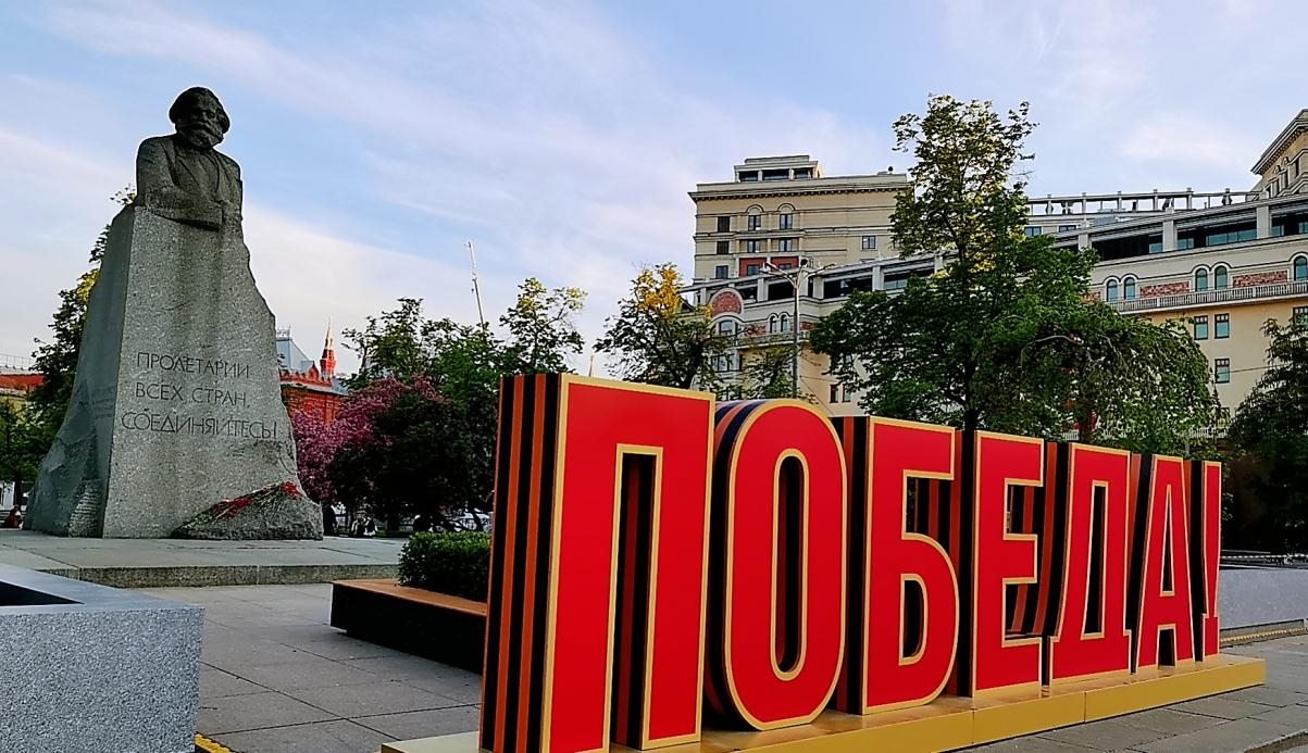 當(dāng)?shù)貢r(shí)間5月6日,莫斯科大劇院對(duì)面,馬克思雕塑前的“勝利”字樣。鄺西曦 攝