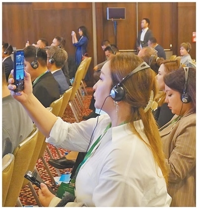 參加2025中國—中亞媒體合作論壇報(bào)道的中亞國家媒體記者正在拍攝視頻。