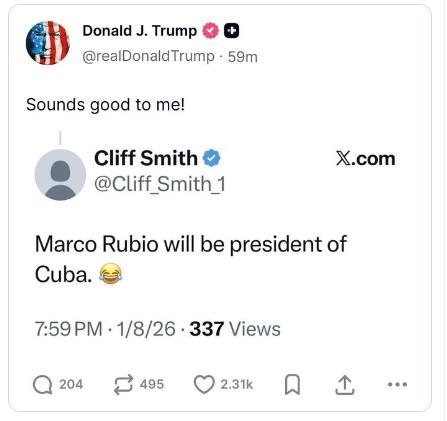 中新網(wǎng)1月12日電 據(jù)??怂剐侣劗?dāng)?shù)貢r(shí)間11日?qǐng)?bào)道,美國總統(tǒng)特朗普在社交平臺(tái)上回應(yīng)一則帖文,該貼文稱美國國務(wù)卿魯比奧“將成為古巴下一任領(lǐng)導(dǎo)人”。