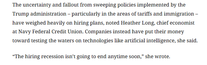 報道還援引美國海軍聯(lián)邦信用合作社(Navy Federal Credit Union)首席經(jīng)濟學家希瑟·朗的觀點稱,特朗普政府推行的一系列政策,尤其是關稅和移民政策,所帶來的不確定性及后果對招聘計劃造成了沉重影響。希瑟·朗認為,招聘市場的低迷狀況短期內(nèi)不會結束。