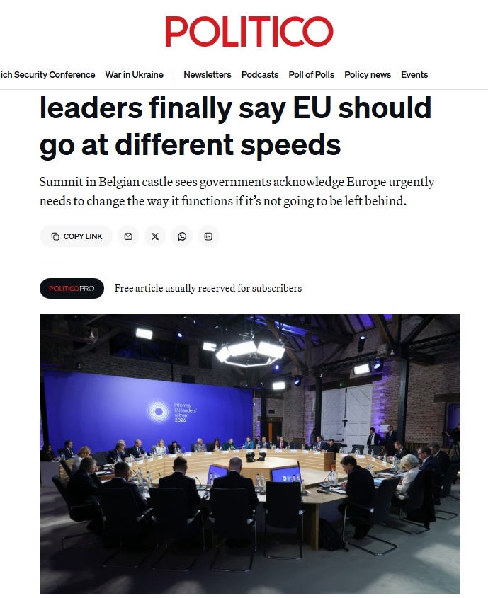 《政治報》網站歐洲版的報道評論稱,歐盟一直以其成員國團結一致向前邁進而自豪,那個時代已經結束了。2月12日在比利時舉行的會議上,法國、德國、意大利等多國領導人支持,最早將于下個月的歐洲理事會上形成一項計劃,以簽署組成更小團體的倡議。各國政府表示,由于歐洲的許多想法陷入優(yōu)柔寡斷和不和諧之中,歐洲的競爭優(yōu)勢正在逐漸消失,因此他們感到一種緊迫感。