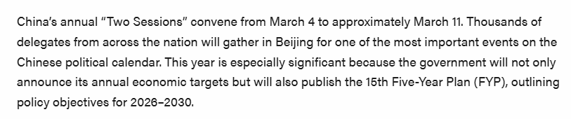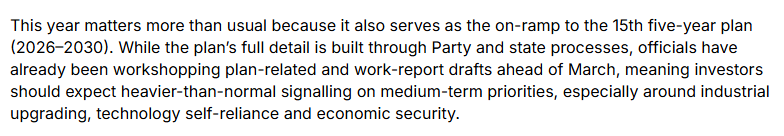 文章說(shuō),今年的兩會(huì)尤為關(guān)鍵,將為第十五個(gè)五年規(guī)劃(2026-2030年)奠定基礎(chǔ)。投資者應(yīng)關(guān)注比往年更明確的政策信號(hào),特別是在產(chǎn)業(yè)升級(jí)、科技自主和經(jīng)濟(jì)安全等領(lǐng)域。