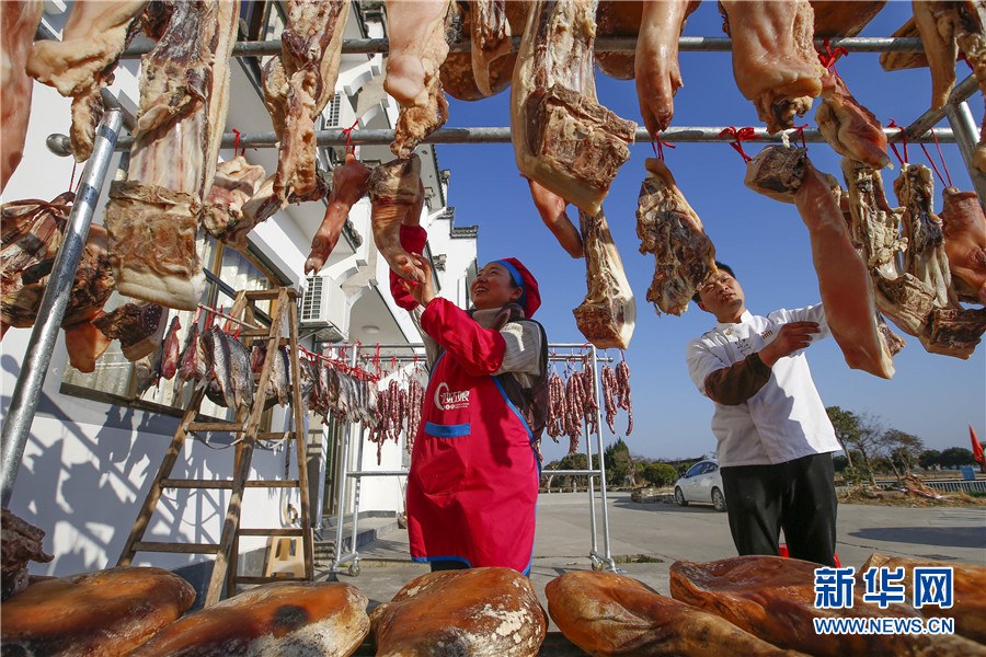 1月19日,在黃山市徽州區(qū)西溪南鎮(zhèn),村民正在腌制臘味。