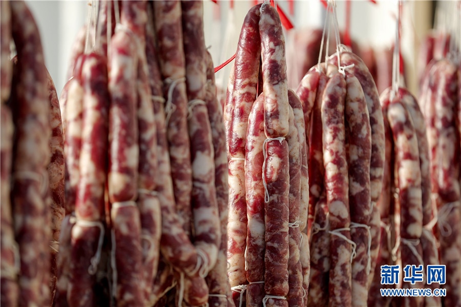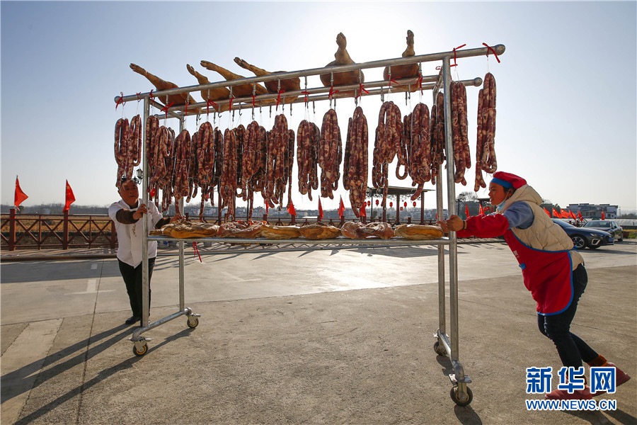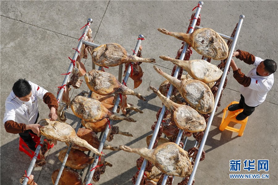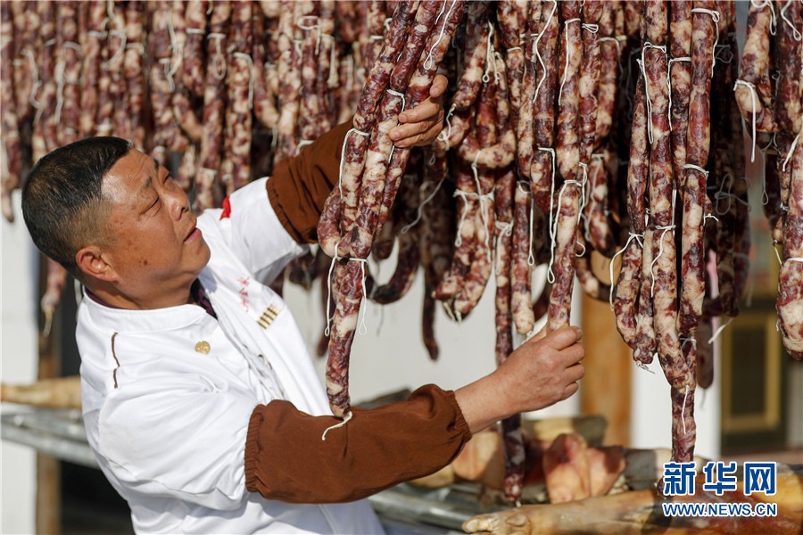 隨著春節(jié)臨近,安徽省黃山市徽州區(qū)西溪南鎮(zhèn)村民開始制作徽州傳統(tǒng)臘味,腌制火腿、臘肉,灌制香腸,并進(jìn)行晾曬。臘味飄香,年味漸濃,制作、晾曬傳統(tǒng)臘味成為徽州一道獨(dú)特風(fēng)景。新華網(wǎng)發(fā)(施亞磊攝)