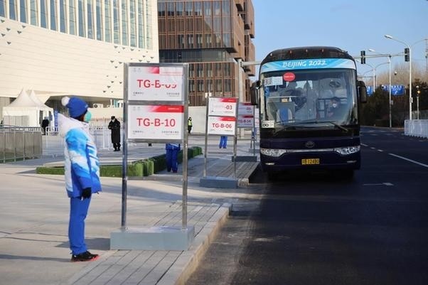 1月10日在主媒體中心外拍攝的交通班車乘車點。新華社記者 徐子鑒 攝