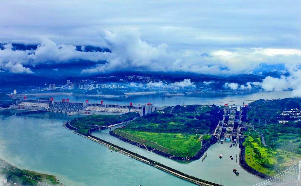 三峽水利樞紐工程全景鳥(niǎo)瞰(左邊為三峽大壩,右邊為船閘)。三峽集團(tuán)流域管理中心供圖