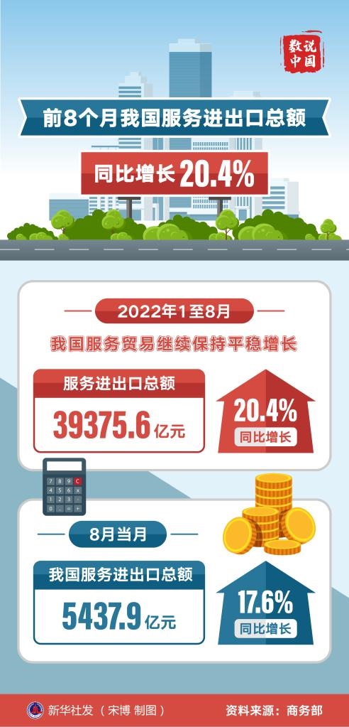 新華社北京10月12日電(記者謝希瑤)商務部12日公布數(shù)據(jù)顯示,今年1至8月,我國服務貿易繼續(xù)保持平穩(wěn)增長。服務進出口總額39375.6億元,同比增長20.4%。
