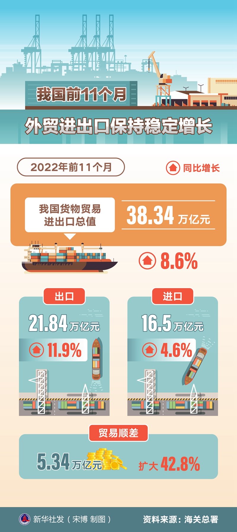 新華社北京12月7日電(記者鄒多為)海關(guān)總署7日發(fā)布數(shù)據(jù):今年前11個(gè)月,我國貨物貿(mào)易進(jìn)出口總值38.34萬億元,同比增長8.6%。其中,出口21.84萬億元,增長11.9%;進(jìn)口16.5萬億元,增長4.6%;貿(mào)易順差5.34萬億元,擴(kuò)大42.8%。
