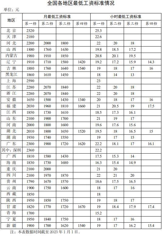 全國各地區(qū)最低工資標(biāo)準(zhǔn)情況(截至2023年1月1日),來自人社部網(wǎng)站