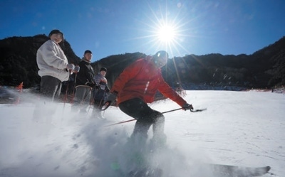 黑崖溝村開設了高山滑雪場,教練為孩子們示范滑雪動作。