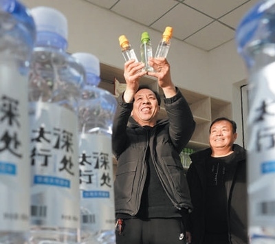 店房村建起飲用水廠,技術人員在展示產(chǎn)品。