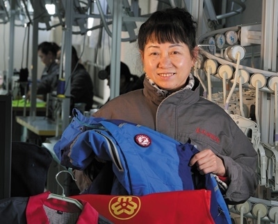 大教廠村服裝車間工人李金榮:“穿上我們做的校服,孩子們更精神了。”