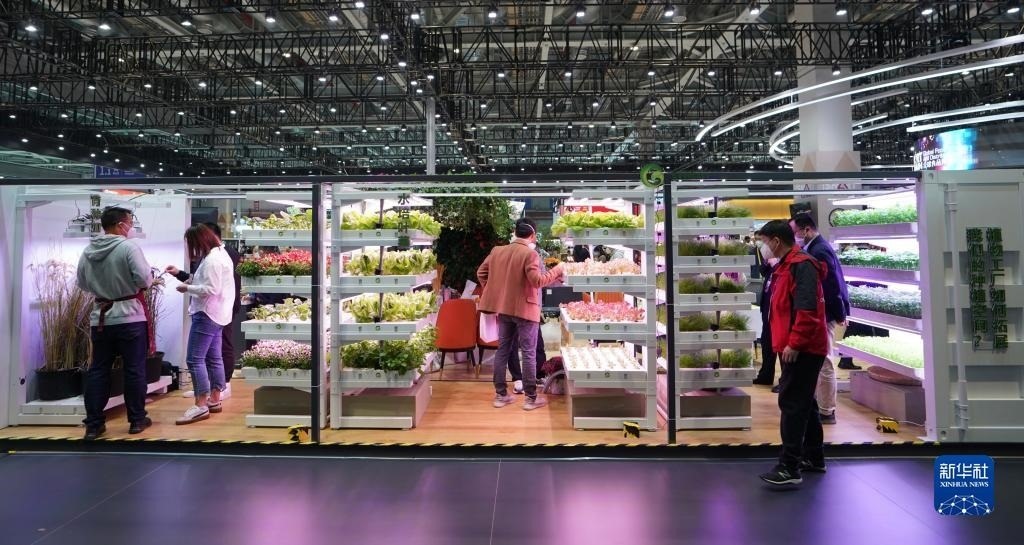 觀眾在第五屆進博會食品及農(nóng)產(chǎn)品展區(qū)參觀集裝箱植物工廠的模型(2022年11月7日攝)。新華社記者 劉穎 攝