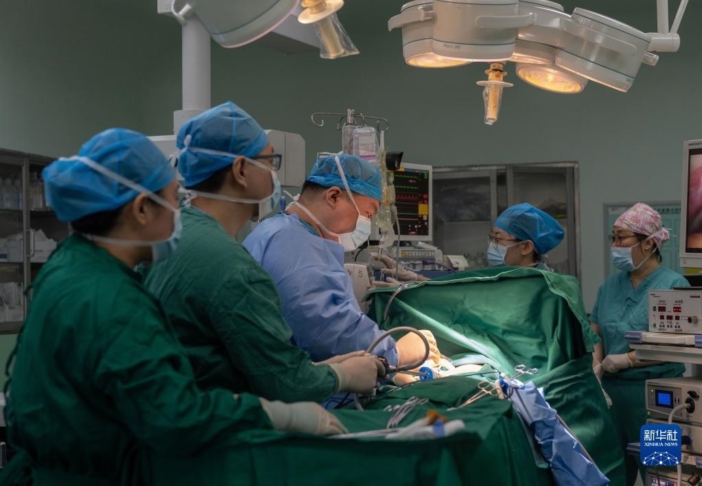 在北京市第六醫(yī)院的醫(yī)聯(lián)體胸外科病房手術(shù)室,北京協(xié)和醫(yī)院與北京市第六醫(yī)院的醫(yī)護人員進行團隊協(xié)作開展胸腔鏡手術(shù)(2021年6月3日攝)。新華社記者 才揚 攝