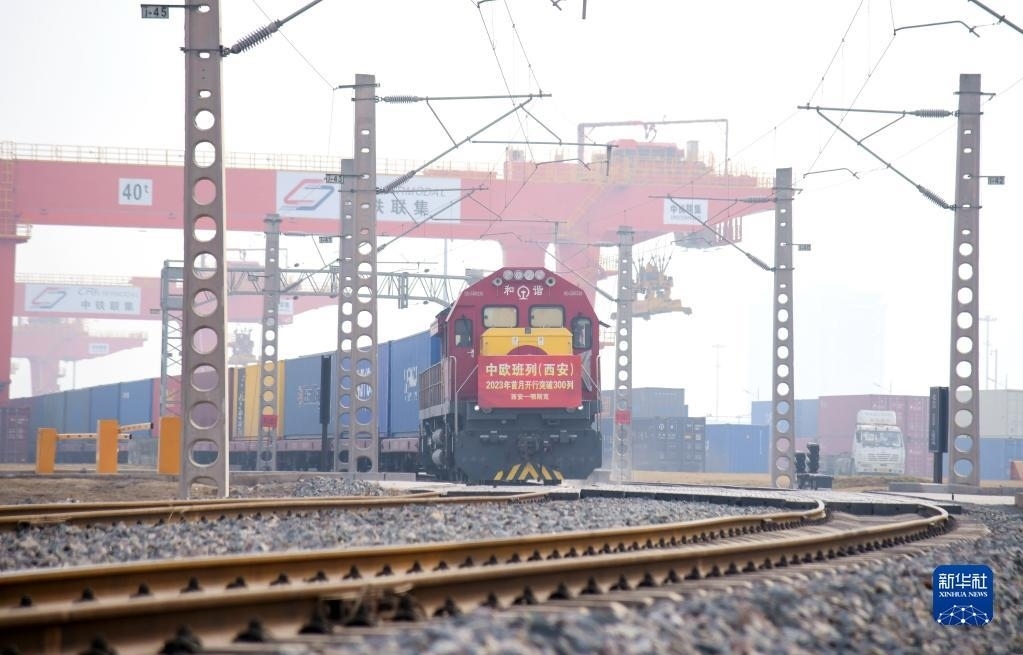 滿載日用百貨的X8151次中歐班列從西安國際港站駛出,開往白俄羅斯首都明斯克(2023年2月1日攝)。新華社記者 李一博 攝