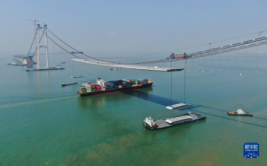 集裝箱貨輪通過正在吊裝鋼箱梁的深中通道伶仃洋大橋(2023年2月22日攝,無人機照片)。新華社記者 鄧華 攝