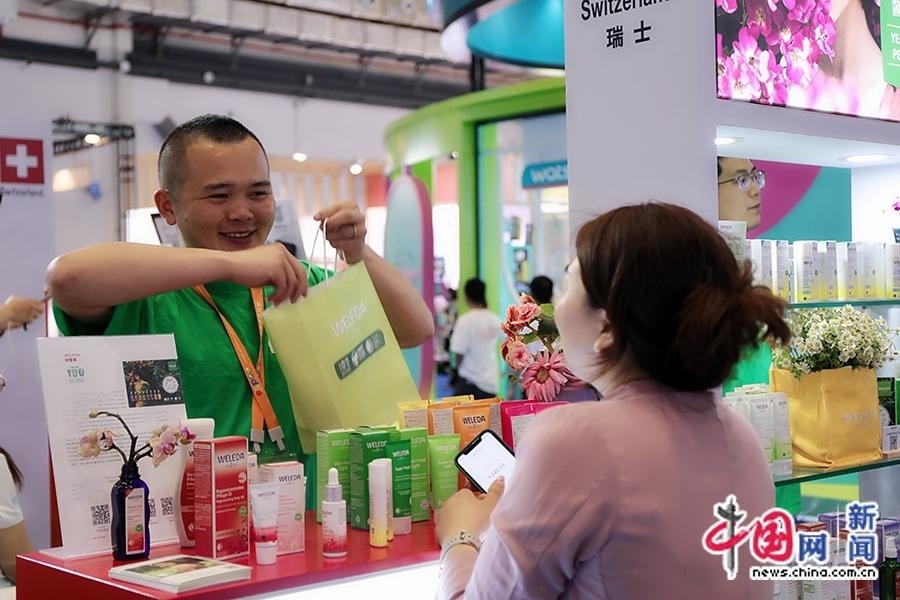 4月11日,工作人員為觀眾介紹瑞士護(hù)膚產(chǎn)品。中國(guó)網(wǎng)記者 吳亮 攝