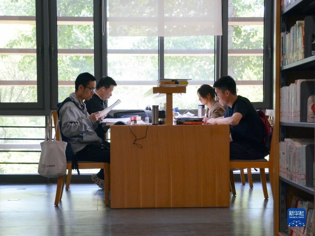 4月29日,在北京外國(guó)語(yǔ)大學(xué)圖書(shū)館,學(xué)生們利用假期讀書(shū)“充電”。