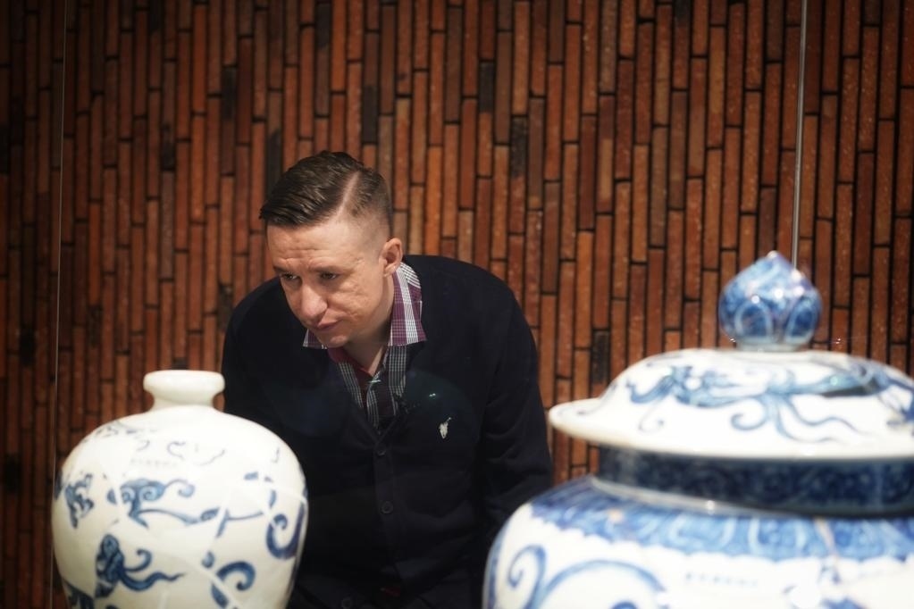 在江西景德鎮(zhèn)御窯博物院的展柜燈光下,一件青花瓷盤散發(fā)著藍(lán)白相間的光澤,疏密有致的葡萄紋在盤中心環(huán)繞生長,紋理細(xì)節(jié)清晰可見。這件燒制于約600年前的宣德青花葡萄紋菱口盤,吸引了來自烏茲別克斯坦的留學(xué)生紹夫卡特·沙穆拉托夫的目光。